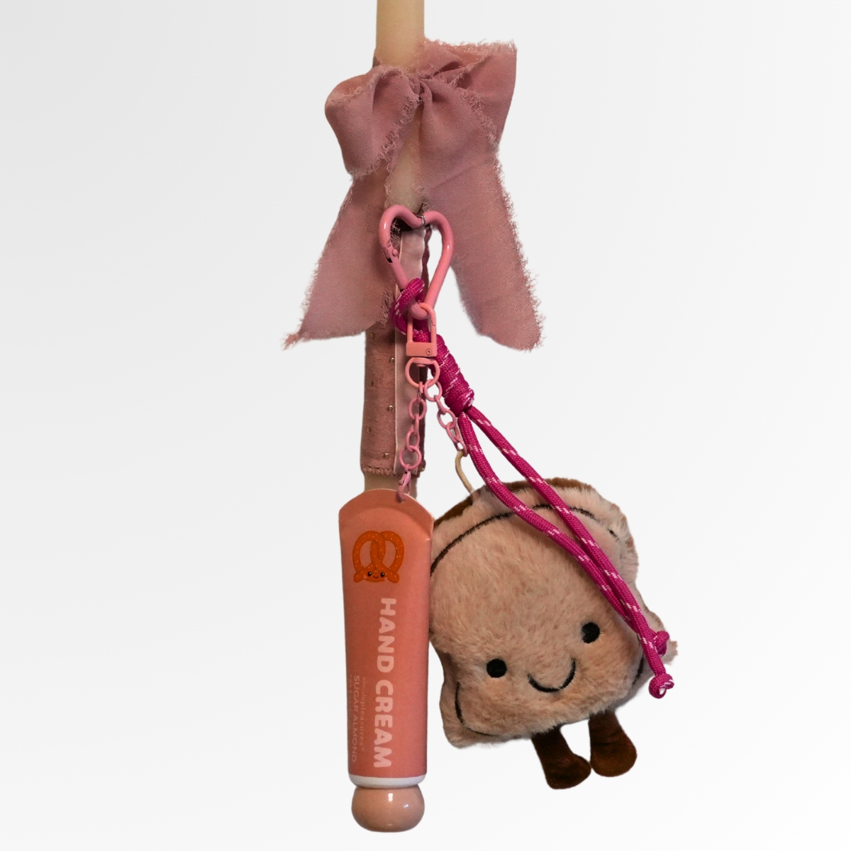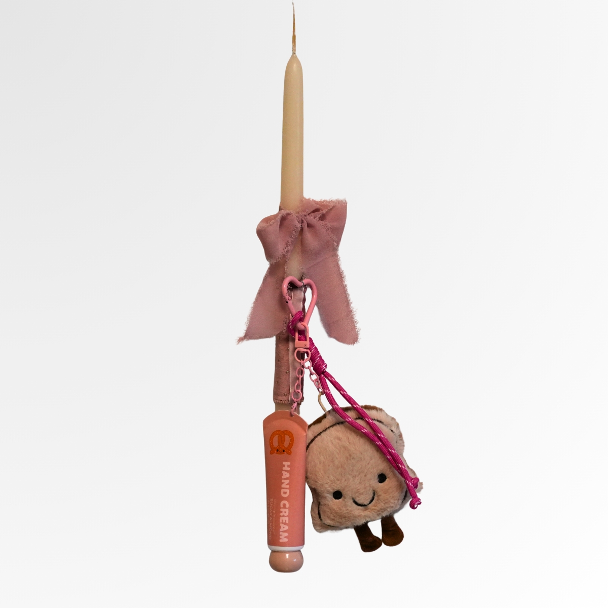 Χειροποίητη πασχαλινή λαμπάδα σε ζεστή καφέ απόχρωση, διακοσμημένη με υφασμάτινο φιόγκο σε απαλό ροζ χρώμα. Συνοδεύεται από χαριτωμένο λούτρινο μπρελόκ με χαμογελαστό σχέδιο και διακοσμητικό lip gloss, δημιουργώντας ένα γλυκό και ιδιαίτερο σύνολο.
