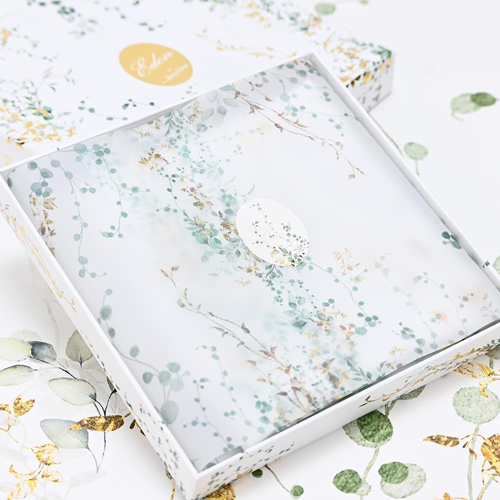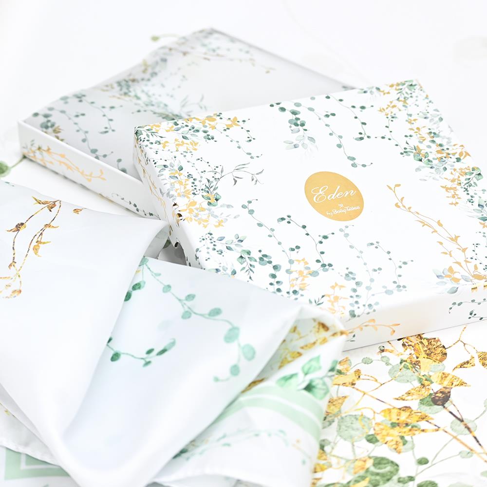 Το μαντίλι της σειράς Eden, με σχέδιο σε γήινες αποχρώσεις του πράσινου και λεπτομέρειες με χρυσές πινελιές, σε διάσταση 50x50cm, αποπνέει φρεσκάδα και εκλεπτυσμένο στυλ.