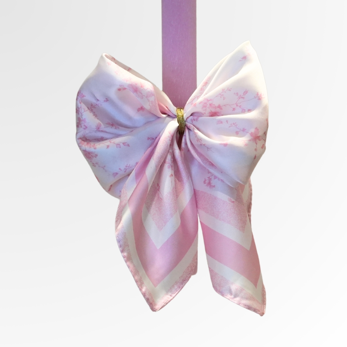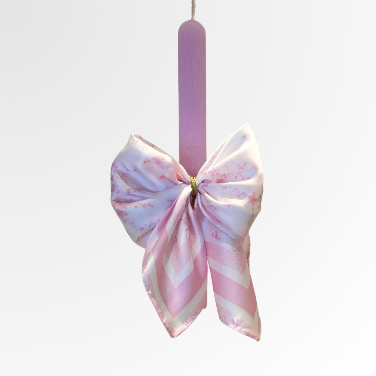 Η λαμπάδα είναι διακοσμημένη με έναν εντυπωσιακό, αέρινο φιόγκο σε λευκή απόχρωση, εμπλουτισμένο με ροζ λουλούδια που ξυπνούν εικόνες από φωτεινές, γιορτινές πασχαλινές ημέρες. Το ημιδιάφανο ύφασμα του φιόγκου χαρίζει μία ανάλαφρη, ρομαντική κίνηση, ενώ η υφή του προσθέτει μία διακριτική πολυτέλεια που αναδεικνύει τη συνολική σύνθεση.