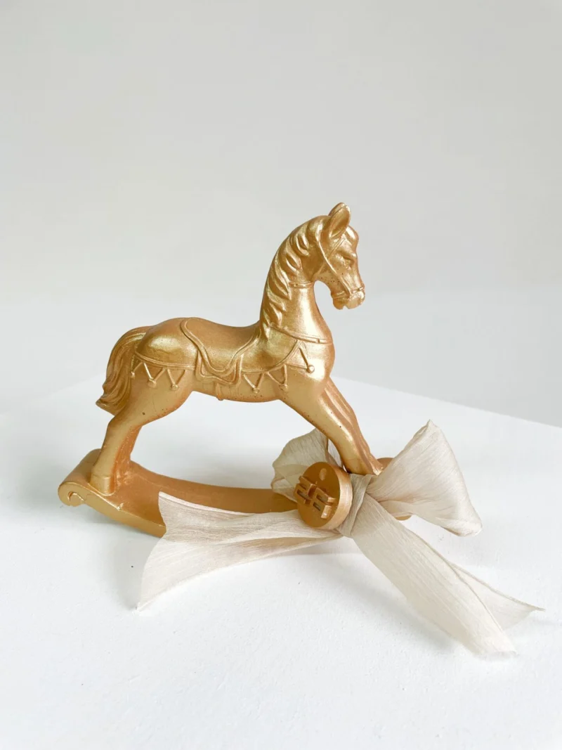 Το μεγάλο κουνιστό αλογάκι της Έλενας Μανάκου, σε χρυσό φινίρισμα, αποτελεί ένα κομψό και νοσταλγικό γούρι.