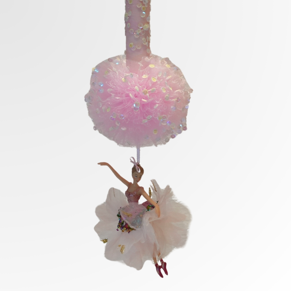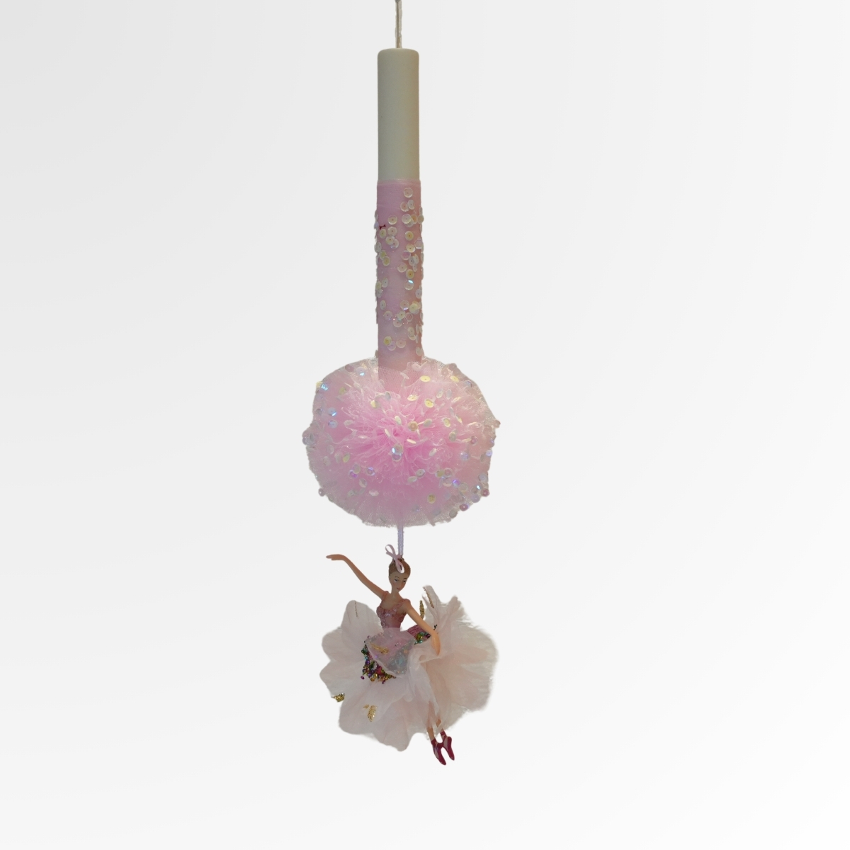 Χειροποίητη αρωματική πασχαλινή λαμπάδα με μπαλαρίνα, διακοσμημένη με λαμπερές πούλιες ιδανική για ξεχωριστές εμφανίσεις το Πάσχα. Η λαμπάδα είναι διακοσμημένη με εντυπωσιακό χειροποίητο πον πον από απαλό τούλι , που προσδίδει κομψότητα και μοναδικό χαρακτήρα. Στο κάτω μέρος κρέμεται μια μπαλαρίνα, δημιουργώντας μια παραμυθένια αίσθηση.