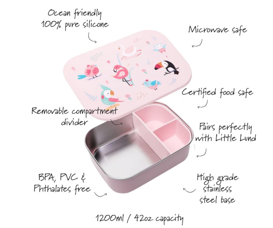 Το ελαφρύ κουτί από ανοξείδωτο ατσάλι διαθέτει αφαιρούμενο διαχωριστικό σιλικόνης, κατάλληλο για τρόφιμα, για να μοιράζεστε το γεύμα σας σε πρακτικά διαμερίσματα. Με διαστάσεις 19,7 x 14,2 x 6cm, είναι το τέλειο μέγεθος για τα μικρά χεράκια.