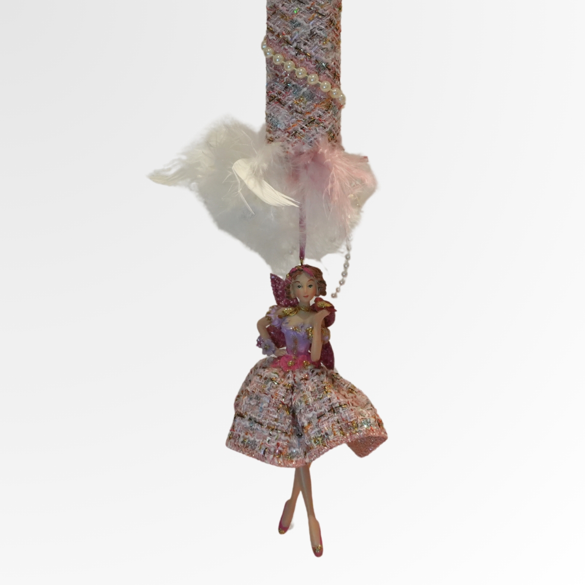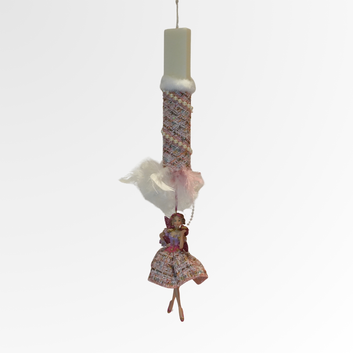 Η λαμπάδα είναι διακοσμημένη με υφάσματα σε απαλές ροζ αποχρώσεις, ενώ οι πέρλες και τα διακριτικά στολίδια προσθέτουν μια όμορφη λάμψη στο σύνολο. Τα φτερά και οι λεπτομέρειες γύρω από τη φιγούρα ενισχύουν τη συνολική αισθητική και δημιουργούν ένα αρμονικό αποτέλεσμα.