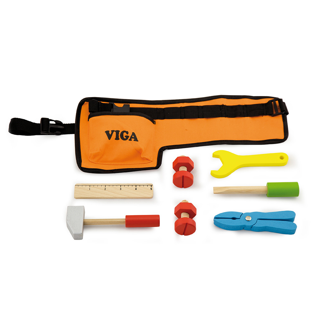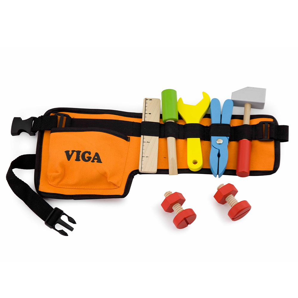 Ζώνη με ξύλινα εργαλεία για τους μικρούς μάστορες από την εταιρεία Viga. Σφυρί, κλειδί, πένσα, κατσαβίδι, χάρακας, 2 βίδες και 2 παξιμάδια. όλα είναι συγκεντρωμένα στην ζώνη εργασίας για να επισκευάστε τα πάντα! Ο ιμάντας της ζώνης προσαρμόζεται εύκολα στην μέση του κάθε παιδιού. Τα ξύλινα εργαλεία τοποθετούνται μέσα στις θήκες της ζώνης και συγκρατούνται με ελαστική ταινία. Ένα παιχνίδι ρόλων εξαιρετικής ποιότητας και αισθητικής για παιδιά άνω των 3 ετών. Διαστάσεις 36 x18 x25 εκ.