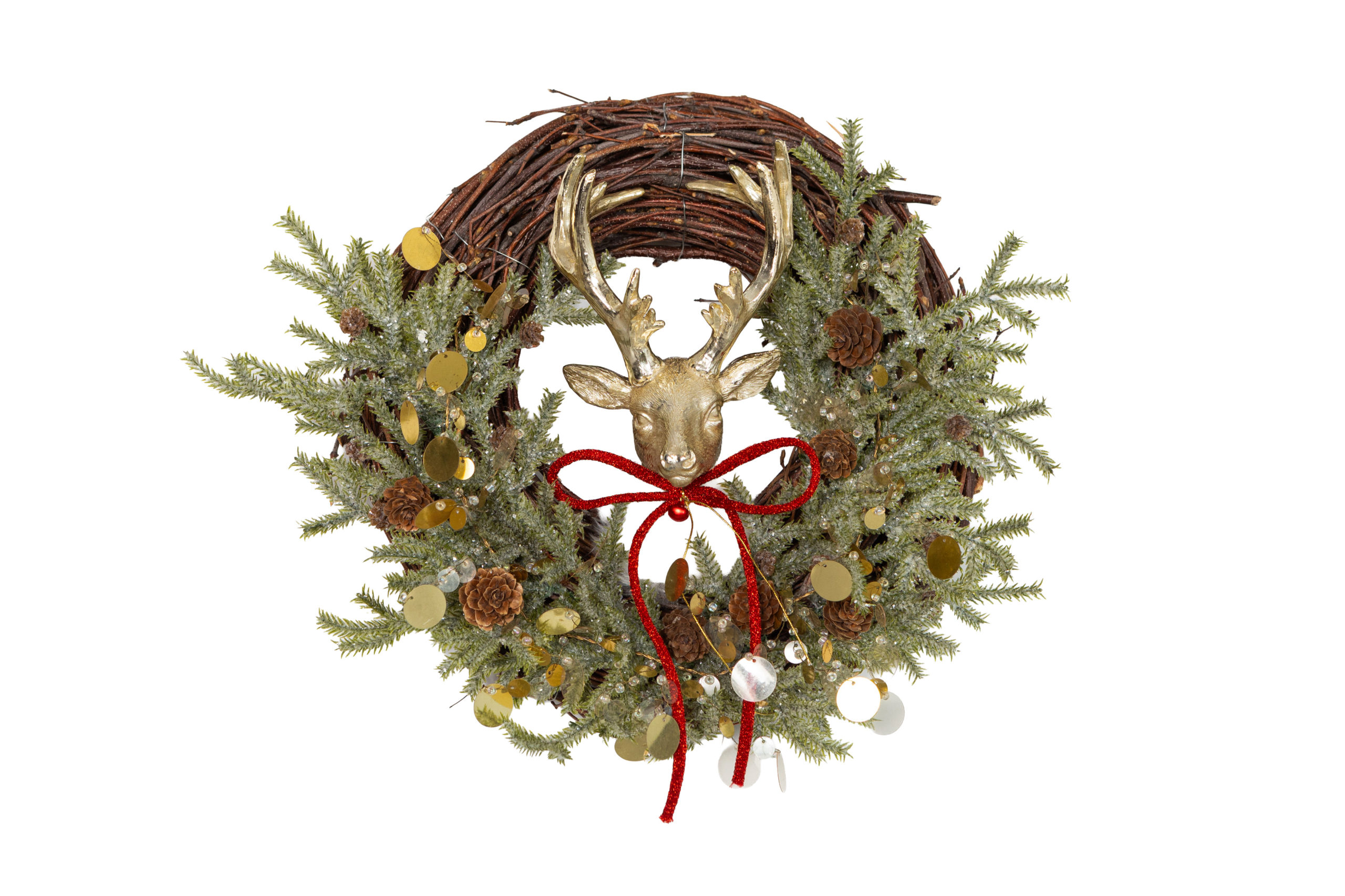 Φέρε στο σπίτι σου τη ζεστασιά και τη μαγεία των γιορτών με αυτό το υπέροχο χριστουγεννιάτικο στεφάνι, διακοσμημένο με ένα χαριτωμένο ελαφάκι και μία εντυπωσιακή γιορτινή κόκκινη κορδέλα.